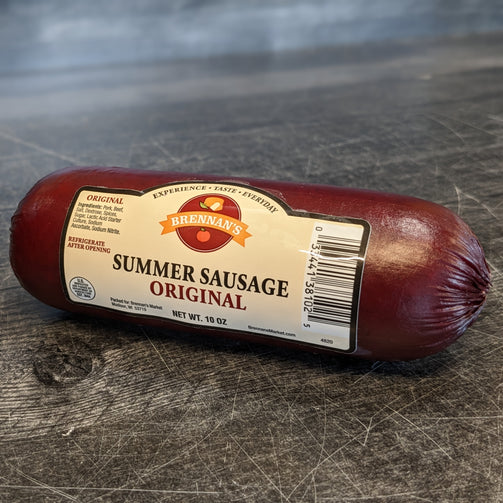 Farm-style summer sausage featuring lean beef and pork coarsely ground, spiced to perfection. Crafted in the European tradition this semi-dried summer sausage is slowly smoked for days over hickory slabs. The result is a distinctive tangy flavor.