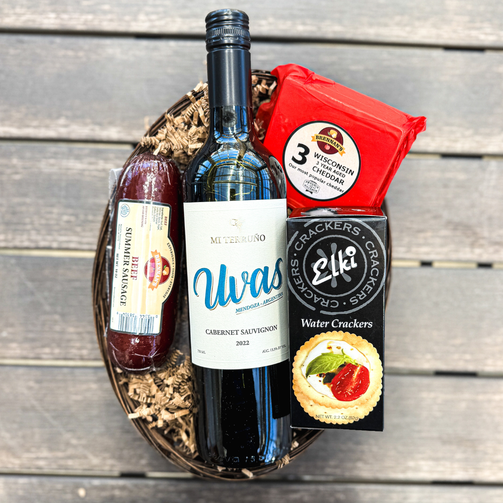 11 oz 3-Year Aged Cheddar, 10 oz Brennan's Beef Summer Sausage, Red Wine, Crackers.